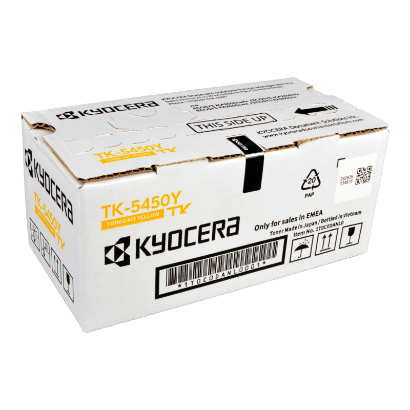 Желтый картридж Kyocera TK-5450Y относится к лазерному типу печати, а его ресурс при заправке составляет 3200 старниц при 5% заполнение листа.